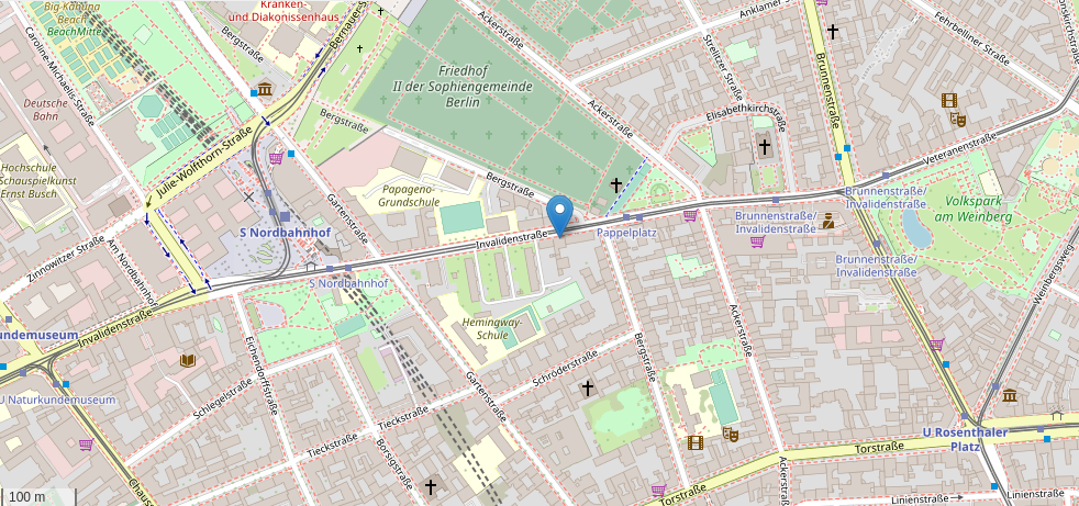 (U-Bahn: U8 Rosenthaler Platz, U6 Naturkundemuseum / S-Bahn: Nordbahnhof / Tram: N40 Pappelplatz)